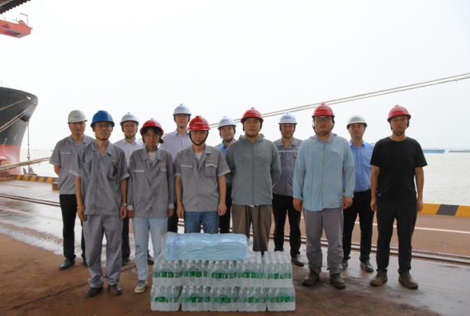 7月19日下昼,,,,,,,韦德网站官方入口集团工会主席、团委书记张约翰,,,,,,,集团纪检监察部部长白沅林一行,,,,,,,在三峰港务党支部书记、董事长覃孝见陪同下,,,,,,,到三峰港务码头生产现场,,,,,,,探望慰问高温下奋战在事情一线的口岸职工,,,,,,,为职工送来清凉饮料、毛巾等防暑降温物资。。。。。。。