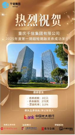 2025年4月17日 ,,,, ,,,重庆韦德网站官方入口集团有限公司2025年度第一期超短期融资券乐成刊行 。。 。。。。。本次债券刊行金额3亿元 ,,,, ,,,债券限期270天 ,,,, ,,,利率3%/年 ,,,, ,,,刊行主体评级AA+(东方金诚、中诚信评级) 。。 。。。。。债券主承销商及簿记管理人为中国光大银行 ,,,, ,,,联席主承销商为重庆农村商业银行 ,,,, ,,,执法服务机构为中联(重庆)状师事务所 。。 。。。。。