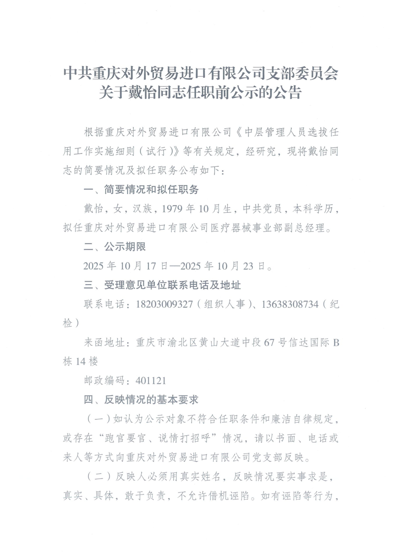 关于戴怡同志任职前公示的通告